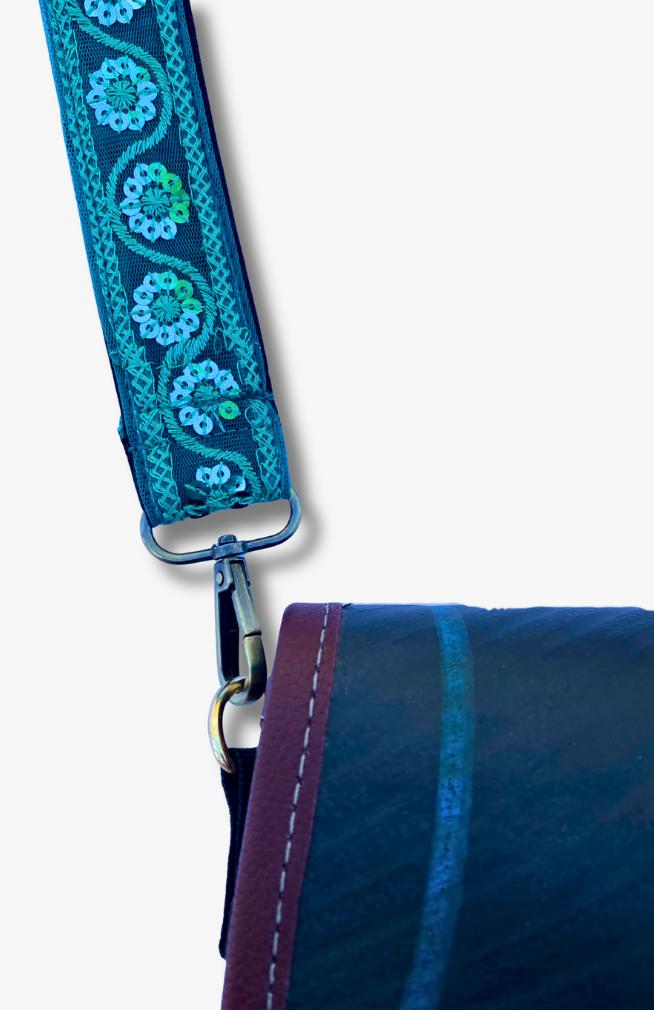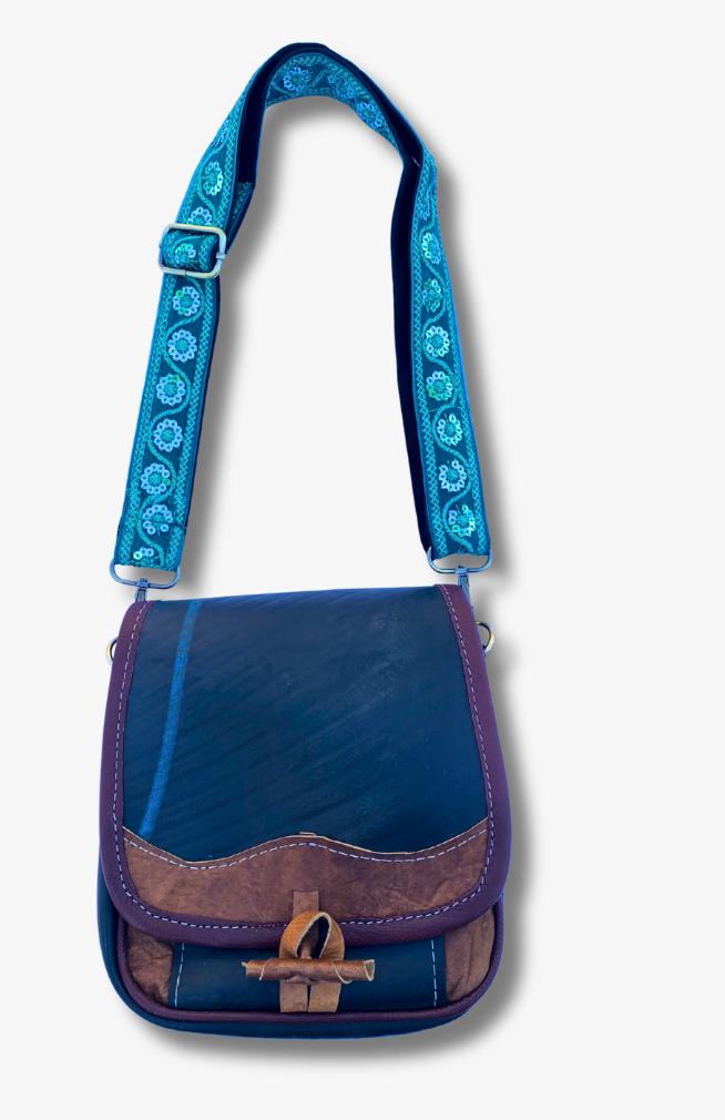 Trash to gold! This cute purse made from recycled inner tubes is perfect for those who like a smaller bag. Small, stylish and practical, it has a long adjustable web strap and is completely lined with cotton. Three credit card slots an inner zip pocket and a divider are sewn inside. The purse has a flap that closes with a “no kill” leather toggle and loop and no kill leather accents.